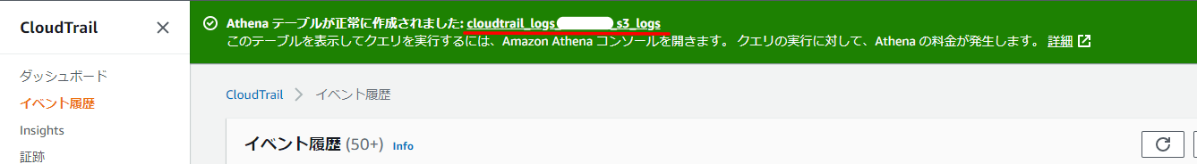 CloudTrailサービスより”イベント履歴”を選択し、「Athenaテーブル作成」をクリック