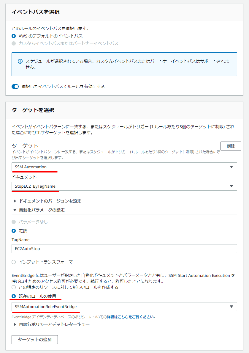 先ほど作成したAutomationをEventBridgeから特定時間に呼び出すように設定していきます。